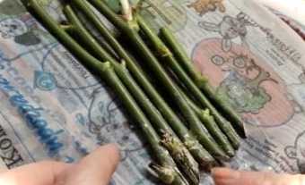 - Змочуємо водою іншу газету і загортаємо живці по діагоналі. Необхідно загорнути так, щоб живці з усіх боків були загорнуті у вологий папір;