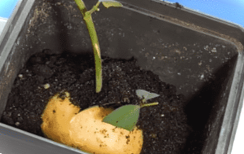 - Потім у горщик насипаємо трохи землі і ставимо туди черешок з картоплею. Зверху присипаємо землею та поливаємо водою.