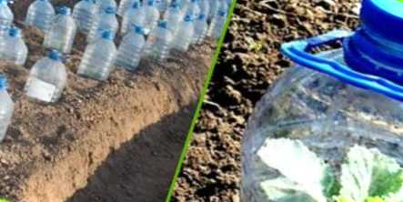 - Прикриваємо лунки зверху пляшками, злегка їх заглиблюючи або підсипаючи до них землю.