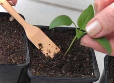 Утримуючи сіянець вертикально, обережно підсипаємо землю і злегка її утрамбовуємо. Трохи заглиблюючи сіянець, на молодій рослині від стовбура відростуть нові коріння. Пізніше, коли рослина зміцніє і стовбур перцю загрубіє, підсипати землю вже не можна. Підсипання землею вплине на майбутній урожай, відсуваючи отримання перших плодів.