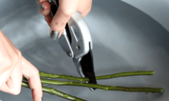 - Стебло зрізаємо секатором у тазу з водою або під струменем води. Стебло щоразу підрізаємо навскіс, щоб вода проникала в стебло.