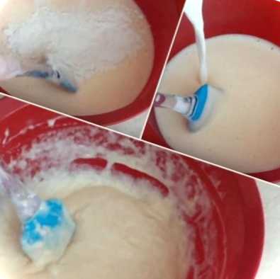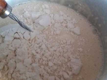 Потім, не перестаючи заважати, додаємо в тісто окріп. Добре перемішавши тісто, залишаємо його на 20-30 хвилин за кімнатної температури.