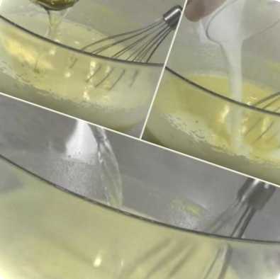 Віночком або міксером збиваємо яйця з сіллю та цукром до густої піни. Потім вливаємо олію і продовжуємо збивати. Тонким цівком додаємо тепле молоко, продовжуючи збивати суміш.