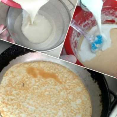 Тонким цівком додаємо в тісто окріп, продовжуючи збивати його міксером. Додаємо олію, знову добре перемішуємо. Залишаємо тісто на 15 хвилин, щоб воно "дійшло", а потім випікаємо, як звичайні млинці.