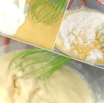 Додайте масло|мастило|, а потім муку|борошно|, одночасно продовжуючи розмішувати віночком тісто. Продовжуйте збивати, доки тісто не стане однорідною консистенцією без грудочок.