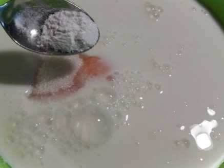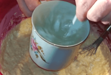 У велику склянку окропу додаємо половину чайної ложки соди, швидко перемішуємо, виливаємо в миску і трохи збиваємо і залишаємо тісто на 5 хвилин.