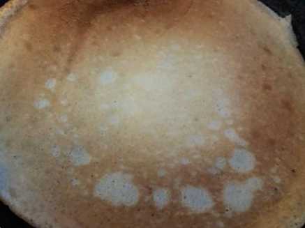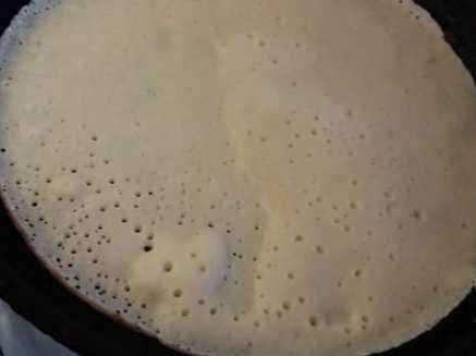 Орієнтиром того, що він пропекся, буде рум'яний краєчок по краю. Потім млинець, підхоплюючи за край руками або за допомогою лопатки, перевертаємо на інший бік і допікаємо до готовності.