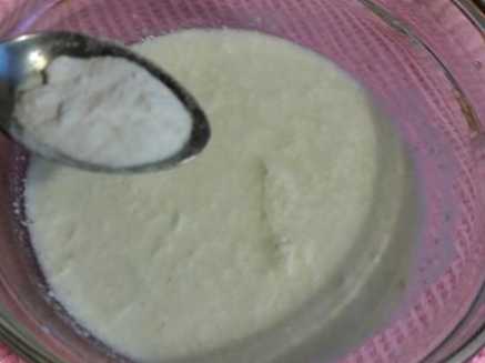 Простоквашу виливаємо в глибоку миску, додаємо туди сіль, цукор та соду. Перемішуємо і залишаємо на 3-5 хвилин, щоб сода вступила в реакцію.