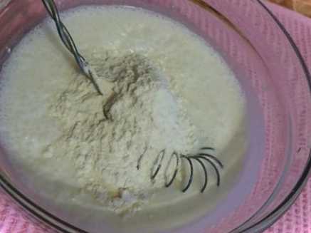 Додаємо 1 склянку борошна, розмішуємо, потім другу склянку з борошном і добре розмішуємо.