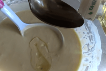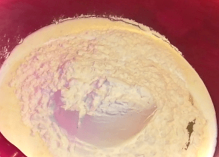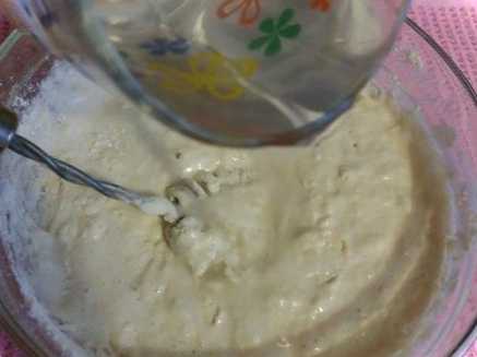Оскільки сама по собі кисла густа, та ще змішана з борошном маса у нас виходить дещо густа, тому її розводимо, вливши в суміш півсклянки теплої води.