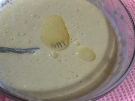 Бачите, яке тісто вийшло: однорідне, з бульбашками. Потім при випіканні бульбашки лопатимуться, а на їхньому місці утворюються дірочки. Через деякий час, коли тісто відпочило, на плиту ставимо сковорідку, добре її розігріваємо. Перед тим, як налити тісто вперше, змащуємо сковороду тампоном, змоченим у олії. Надалі цю процедуру проводити не потрібно, оскільки в тесті вже є олія.