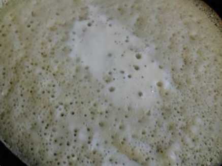 Тим часом поставте сковорідки на вогонь, щоб добре прогрілися. Перед тим як налити тісто вперше, змастіть сковороду маслом, так перший млинець не вийде грудкою і легко можна перевернути. Потім змащувати сковороду не потрібно, тому що в тесті вже є олія. Наливши тісто на сковороду, ви відразу помітите, скільки дірочок вже утворилося.