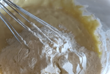 Додаємо муку|борошно| і розмішуємо віночком.