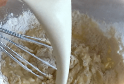 Потім додаємо другу склянку кислого молока і розмішуємо. Це робиться для того, щоб у тесті не залишилися грудочки.