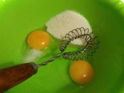 У глибоку миску розбиваємо яйця, додаємо до них сіль і цукор і добре розмішуємо, щоб сипкі добре розчинилися.