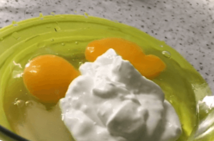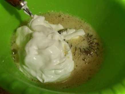 Додаємо сметану до яєць і всі разом добре перемішуємо.