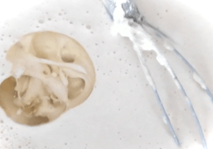 Сметану розбавляємо водою, туди ж додаємо по 1 чайній ложці цукру та соди, і 1/3 чайної ложки солі. Перемішуємо. Після додавання соди ви відразу помітите, що в рідині з'явилися бульбашки, а це означає, що млинці вийдуть з дірочками.