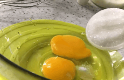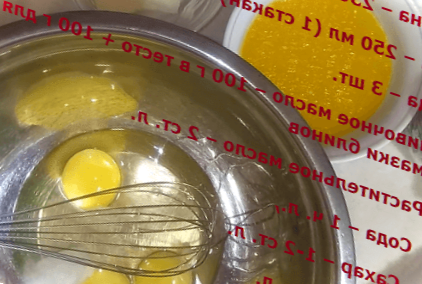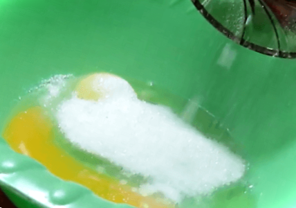 У чашу розбиваємо яйця, додаємо до них цукор та сіль, розмішуємо до однорідної маси.