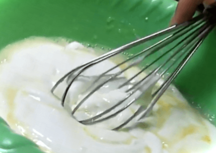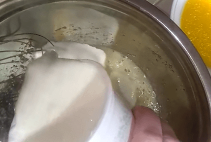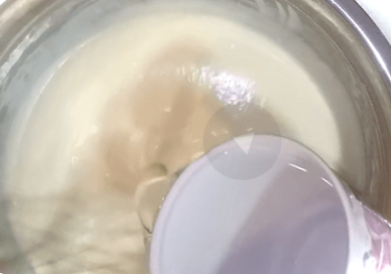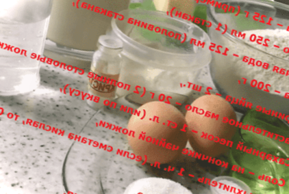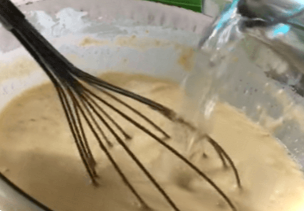 Додаємо до сметани склянку холодної води. Перемішуємо. У результаті у нас виходить 500 мл рідини (вона буде замість молока). Додаємо її до яєчної суміші, перемішуємо.