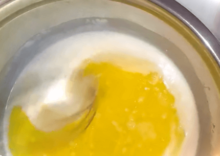 Тим часом ставимо чайник, нам потрібна гаряча вода.Сюди ж додаємо олію, і за бажанням ванілін для аромату. Все добре перемішуємо.