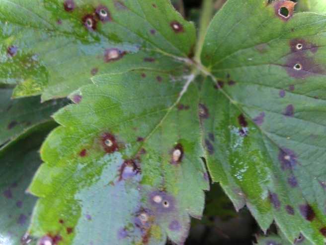 Білі плями в коричневому кільці - це біла плямистість. Спочатку вони виглядають пурпуровими цятками. Потім крупніють, стають овальними. Доходить до того, що лист стає схожим на обпалений папір. Цей грибок поширюється на всю рослину, навіть у ягід навколо насіння з'являється чорнота. Неприємне захворювання. Найкраща його профілактика - суха піднесена грядка.
