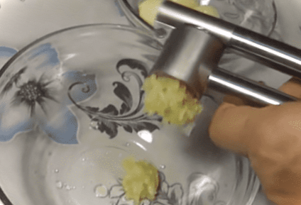 Подрібнюємо часник на часнодавці і відправляємо до овочів у каструлю.