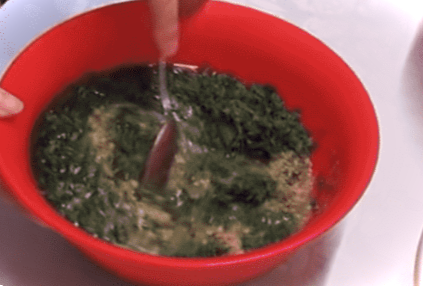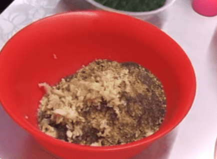 часник пропускаємо через прес і додаємо до спецій. Сюди ж додаємо і дрібно порізану зелень.