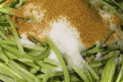 Овочеву суміш посипаємо цукровим піском та сіллю, додаємо чорний та червоний мелений перець, корейську приправу.