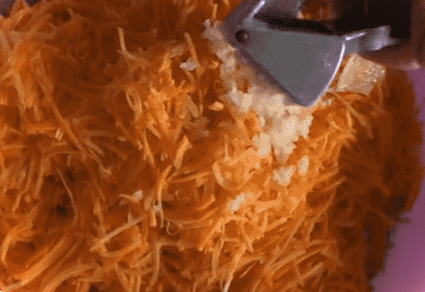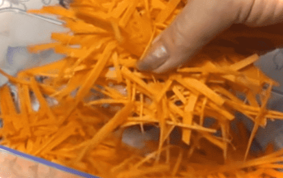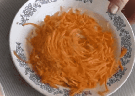 Моркву натираємо на тертці для корейської моркви. Якщо у вас не виявиться такої тертки, натріть моркву на звичайній тертці з найбільшими отворами.