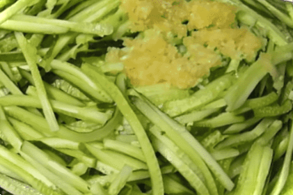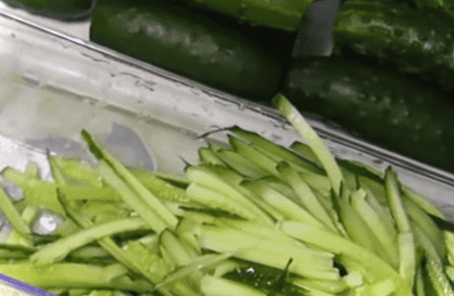 На цій же тертці натираємо огірки, але отвори робимо трохи більшим. За відсутності терки для корейської моркви наріжте плоди спочатку тонкими смужками, а потім кожну смужку - на дрібну соломку.