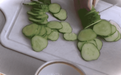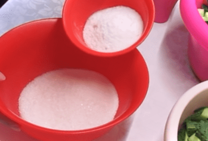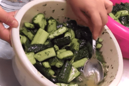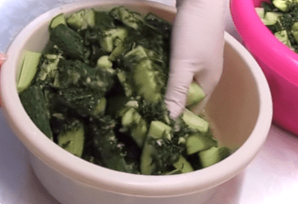 і цією сумішшю заливаємо нарізані огірки. Все ретельно та обережно перемішуємо. Залишаємо суміш на 3 години за кімнатної температури. Кожні півгодини суміш перемішуємо.