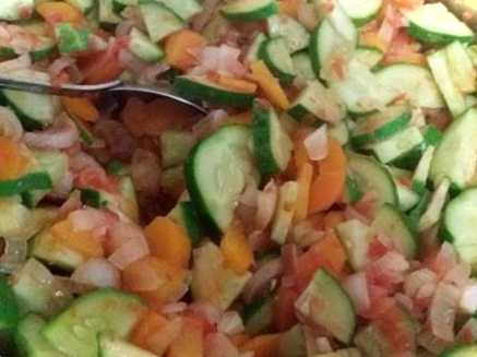 10 хвилин пройшли, додаємо в каструлю огірки, перемішуємо.