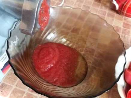 Помідори пропускаємо через м'ясорубку. Викладаємо помідорну масу в глибоку велику каструлю, ставимо її на плиту.