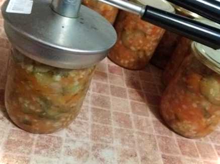 А в це стерилізуємо банки та кип'ятимо кришки. Обов'язково під час гасіння перемішуємо овочеву масу, щоб вона не пригоріла до дна каструлі. Розкладаємо по стерилізованих банках і відразу ж закочуємо.