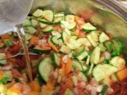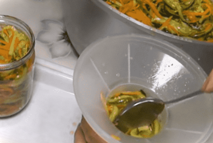 Для заготівлі краще використовувати банки ємністю 0,5 л.Після 3 годин у овочевій суміші утворилося досить багато соку.