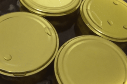 Ставимо банки в ємність для стерилізації, на дні якої покладена серветка. Наливаємо в ємність воду стільки, щоб вона доходила до рівня плічок банок. Ставимо каструлю на вогонь та стерилізуємо 0,5 л банки протягом 15 хвилин з моменту закипання води.