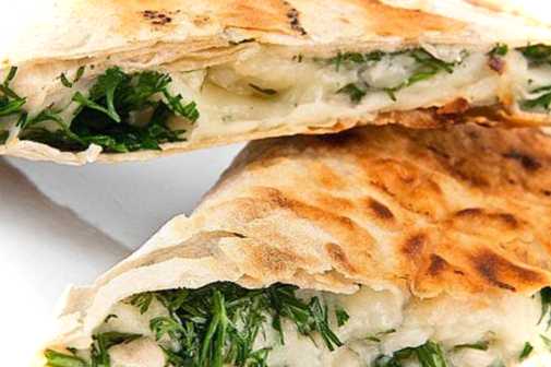 Відмінний варіант гарячої закуски для мангалу. Сир подрібнюємо на великій тертці, кріп дрібно нарізаємо, обидві інгредієнти змішуємо. Томат нарізаємо на середні скибочки. Якщо лаваш великий, його також поділяємо на частини. На один край коржі викладаємо сир із зеленню, на другий - томати. Акуратно загортаємо, щоб вийшов конвертик. Перед обсмажуванням злегка змащуємо олією.