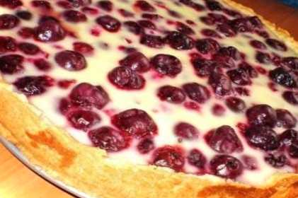 Більший шматок тіста розгортаємо і викладаємо з бортиками у форму. Зверху акуратно поміщаємо ягідну суміш, місцями по ній розкладаємо шматочки із вершкового масла. Другий шматок тіста розгортаємо і нарізаємо смужками, які гратами викладаємо по ягідній масі. Краї прищипуємо до бортиків. Поміщаємо на 10 хвилин у духовку, розігріту до 200 градусів. Потім знижуємо температуру до 180 і готуємо ще 50 хвилин.
