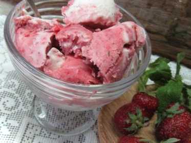 Будь-яку ємність вистилаємо харчовою плівкою, виливаємо половину полунично-вершкової маси, поміщаємо в морозилку на півгодини. Через зазначений час робимо прошарок з ягідного пюре, що залишилося, на яке зверху відразу виливаємо вершкову масу. Закриваємо форму плівкою та поміщаємо в холодильник. Через шість годин найсмачніше морозиво буде готове. Перед подачею рекомендується полити джемом.