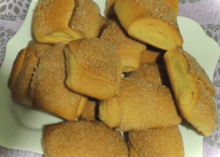 Потім кожну смужку згортаємо нещільно в рулетик, трохи притискаємо його рукою, щоб при випіканні він не втратив свою форму. Обмочуємо один бік у цукровий пісок і викладаємо на лист.