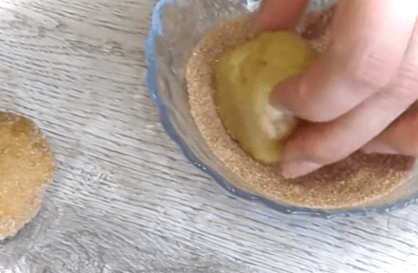 В окремій мисці з'єднуємо цукор та корицю для посипання випічки. Потім беремо невеликий шматочок тіста і в долонях скочуємо з нього кульку. Обмочуємо кульку однією стороною в суміш цукру і кориці і кладемо її на лист цукровою стороною вгору. Так робимо з усім тестом.