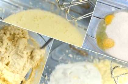 У великій мисці збиваємо міксером протягом 3 хвилин яйця і цукор до пишної піни. Додаємо до них розм'якшене вершкове масло, нарізане невеликими шматочками, і продовжуємо ще збивати 2 хвилини. Додаємо до маси сметану та майонез, і знову збиваємо до отримання однорідної маси.