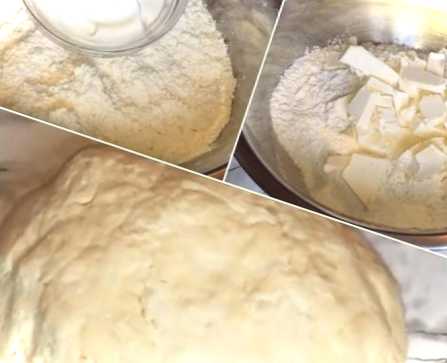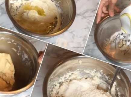 Масло або маргарин розтоплюємо до рідкого стану. У кефір додаємо соду або розпушувач, а потім із усіх інгредієнтів замішуємо тісто. Тісто має вийти м'яким та еластичним, яке не повинно прилипати до рук. Потім його загортаємо в поліетиленовий пакет і забираємо в холодильник на 20-30 хвилин.