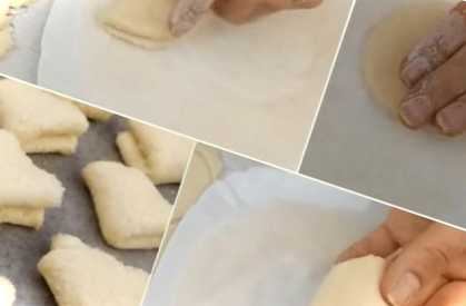 Потім робимо заготівлі. Для цього вмочуємо в цукор кружок тіста однією стороною, складаємо його вдвічі, цукровою стороною всередину. Змочуємо знову одного боку складений кружок у цукор, і знову складаємо вдвічі цукровою стороною всередину. Вмочуємо останній раз заготівлю в цукор однією стороною і викладаємо на деко безцукровою стороною вниз. Так робимо з усіма гуртками та другою частиною тесту.
