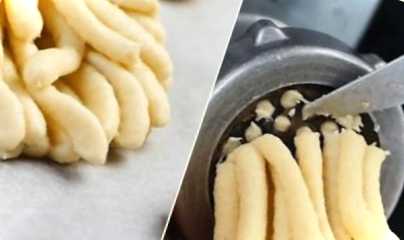 Через півгодини від тесту беремо невеликий шматок та пропускаємо його через м'ясорубку. Відрізаємо тісто, що виходить через м'ясорубку, через кожні 5-7 см, і відрізок акуратно перекладаємо на деко, вистелене папером для випічки. Заготовки кладемо на деякій відстані один від одного, тому що при випіканні тісто збільшиться. Випікаємо в розігрітій духовці за температури 180ºС 30-35 хвилин.