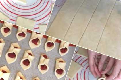 Через цей час дістаємо тісто і розкочуємо його товщиною в 2-3 мм. Підрівнюємо краї, щоб шар був прямокутної форми. Розрізаємо тісто на квадратики розміром приблизно 6х6 см. На кожен квадратик тіста викладаємо трохи повидла. Протилежні кінці, стискаючи пальцями, з'єднуємо разом. Викладаємо готові бантики з тіста на лист, вистелений пергаментом або спеціальним килимком.