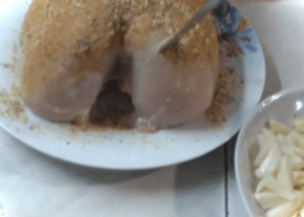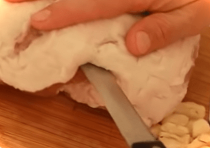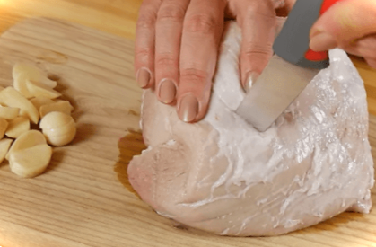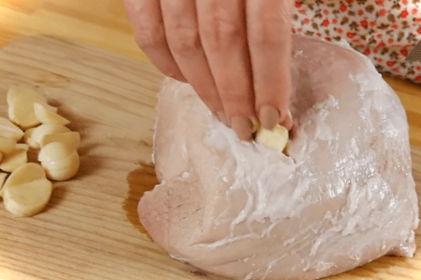 Часник очищаємо та нарізаємо часточки тонкими скибочками. Ножем робимо проколи в курячій м'якоті і туди вставляємо скибочки часнику.