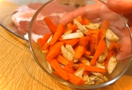 У готовій страві часник, особливо морква, на розрізі виглядатимуть красиво та апетитно.Потім шматок натираємо сіллю зі спеціями.