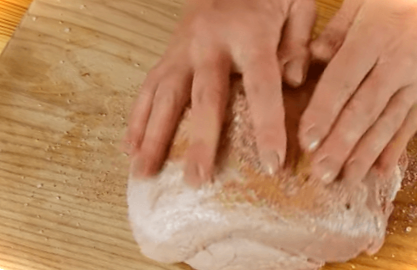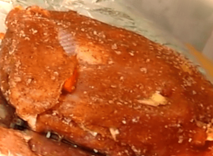 Спочатку посипаємо грудку сумішшю спецій, злегка втираємо в м'ясо.