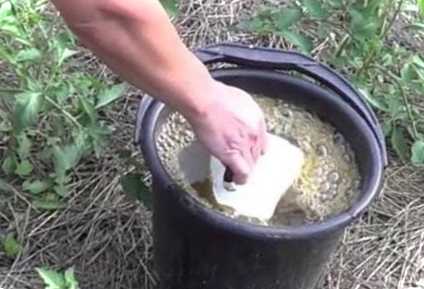 На 3 л теплої води беремо 1 маленький пакетик сухих дріжджів та 2 ст. л. цукрового піску. Все ретельно розмішуємо в банку та прибираємо бродити розчин у тепле місце на добу. Через добу 1 л приготовленого розчину розводимо у 10 л води, або 0,5 л у 5 л води.